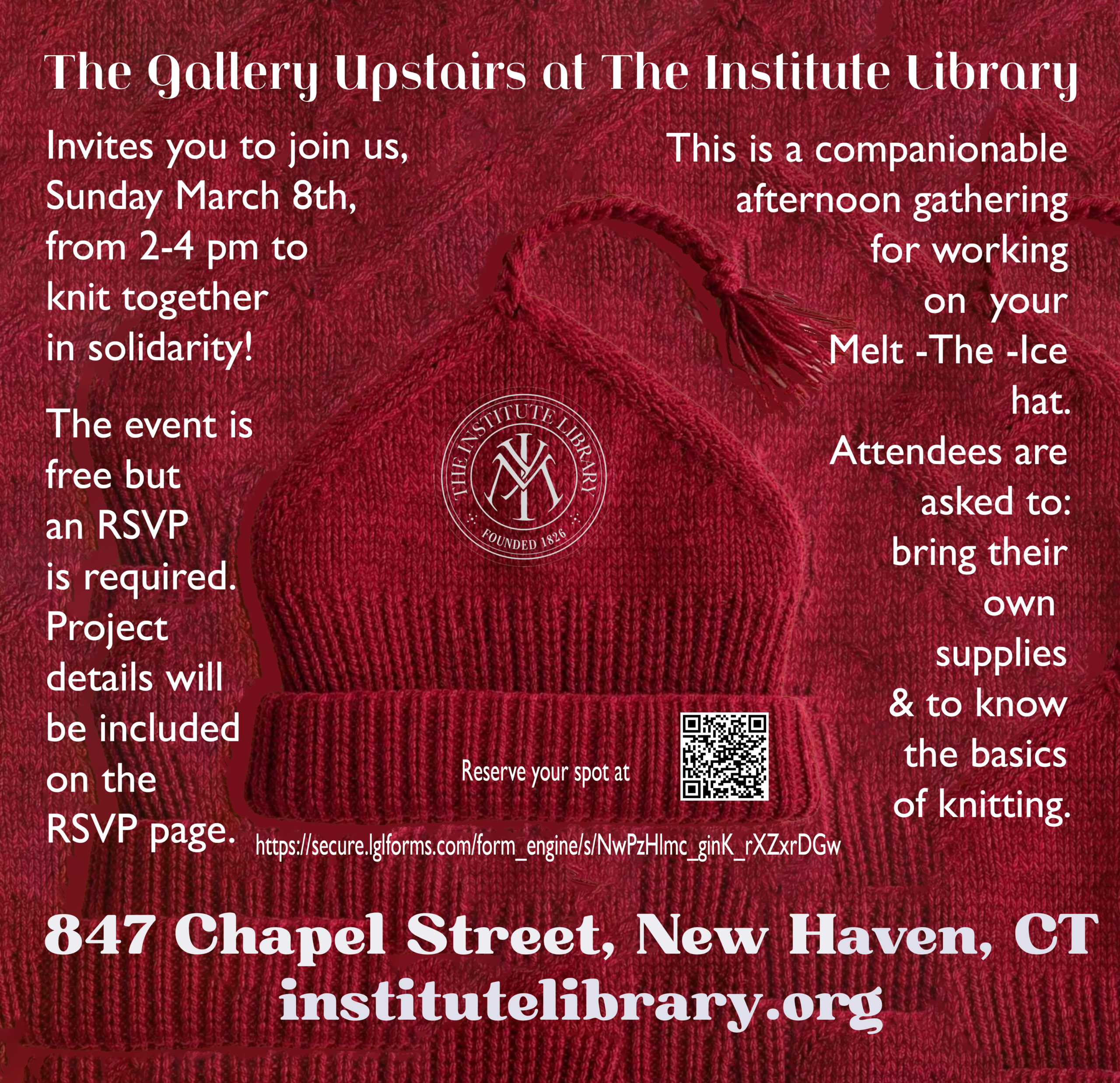A craftivism knit-in to work on Melt-The-Ice Hats offered by The Gallery Upstairs at The Institute Library. Free and open to the public, but donations are happily accepted and will go toward the gallery and future events. We will have snacks, warm drinks and offer a cozy environment to gather, chat and knit. *Please note: This is not a class, and we will not be selling supplies. Please come prepared with Yarn, pattern, knitting needles and other supplies. For more details, please visit our website or send a query to gallery@InstituteLibrary.org or eva@InstituteLibrary.org |
